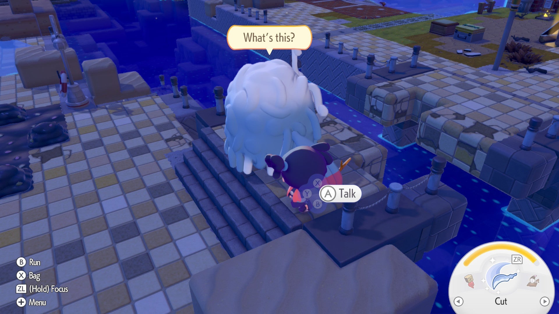 Have Pawmi follow you to the unlit Streetlight. Then follow Trubbish's directions — smash through breakable rocks with Rock Smash to reveal Mosslax!