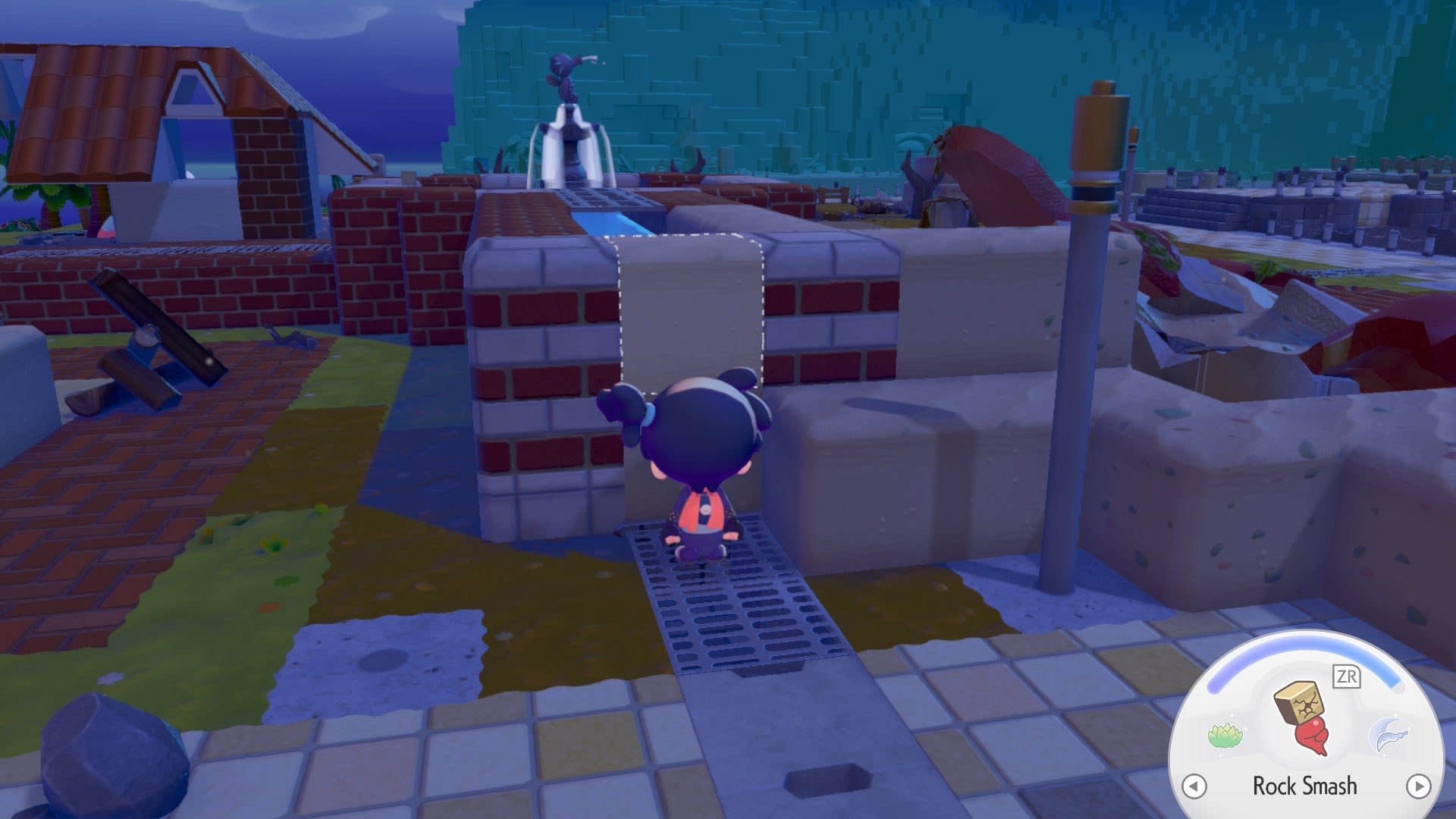 - Go behind the Pokémon Center to find the broken waterway/fountain.