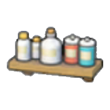 A decorative shelf lined with ceramic bottles. Attach it to a wall to liven up any space!
