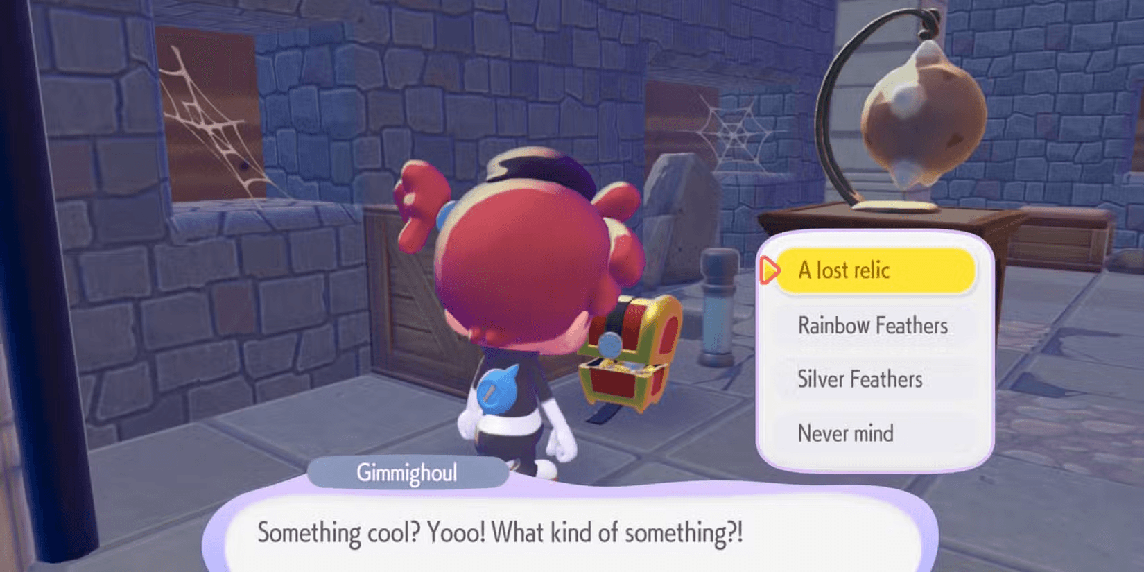 Talk to Gimmighoul and pick the “I brought you something cool!” option to trigger his Collect Specialty. You can hand over an appraised Lost Relic (small or large), a Rainbow Feather, or a Silver Feather and he gives one random rare furniture item back. No preview, just hit confirm and roll the dice.