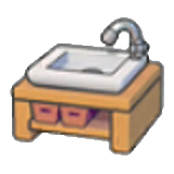 A stylish sink on a wooden stand. Turn on the faucet to make water pour out.